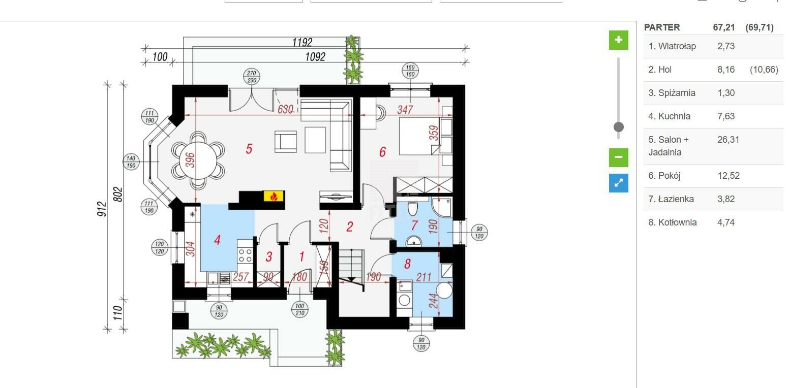 Parter: przestronny salon z miejscem na kominek (idealny na zimowe wieczory), jadalnia, półotwarta kuchnia, dodatkowy pokój (na gabinet albo sypialnię), łazienka z prysznicem i praktyczna kotłownia.